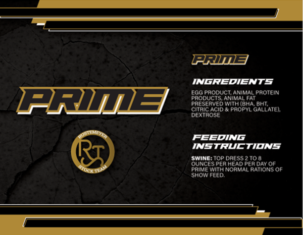 Prime is a top-dress supplement designed to enhance back shape, spread and flesh in your show animals. It features a unique proprietary blend that includes an assortment of protein sources, synthetic amino acids and energy from animal fat.